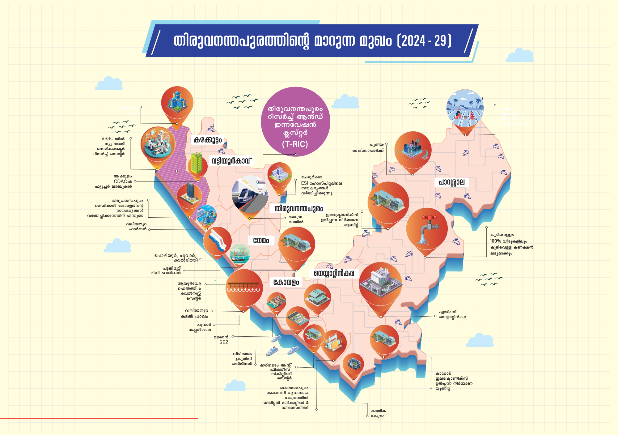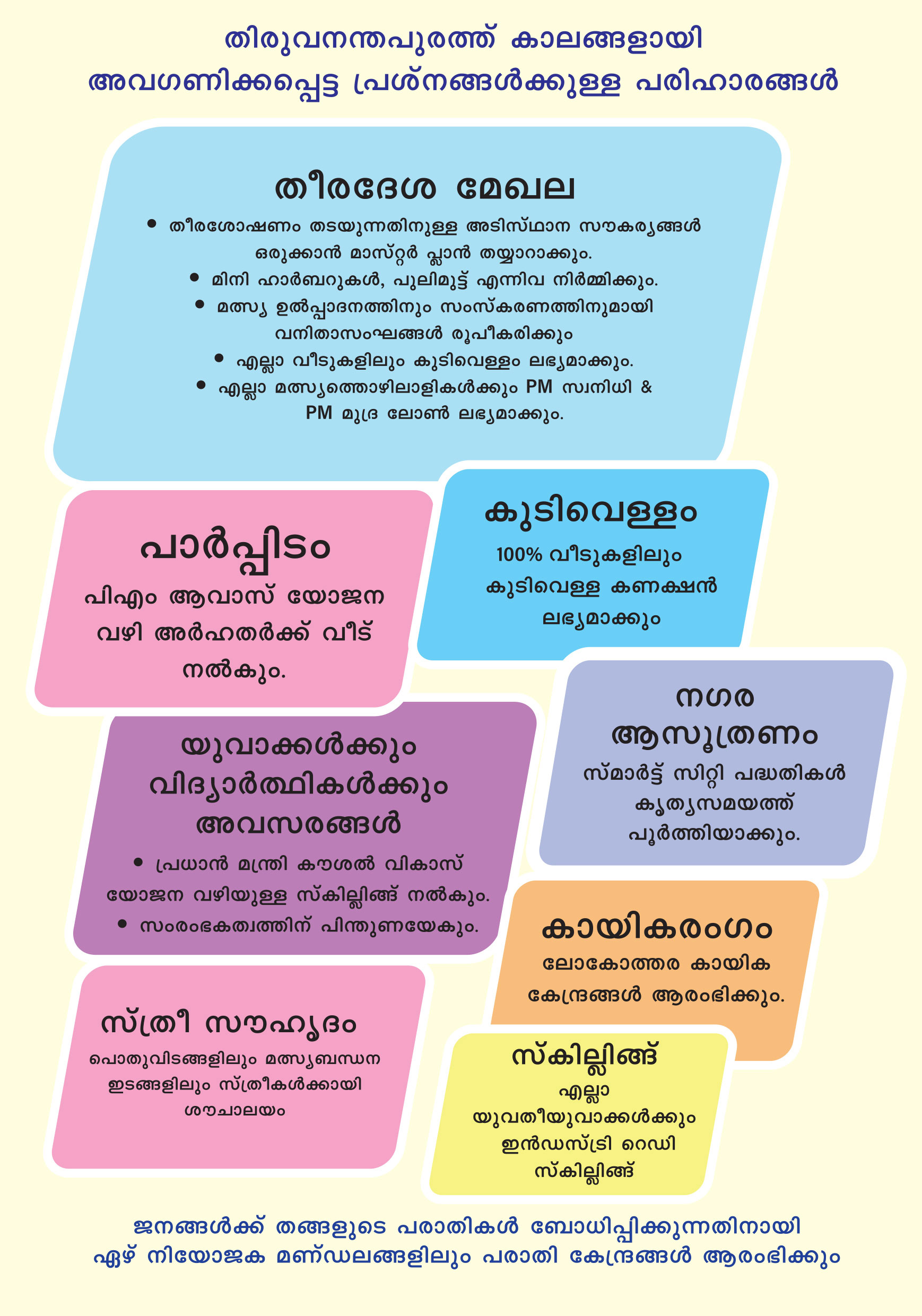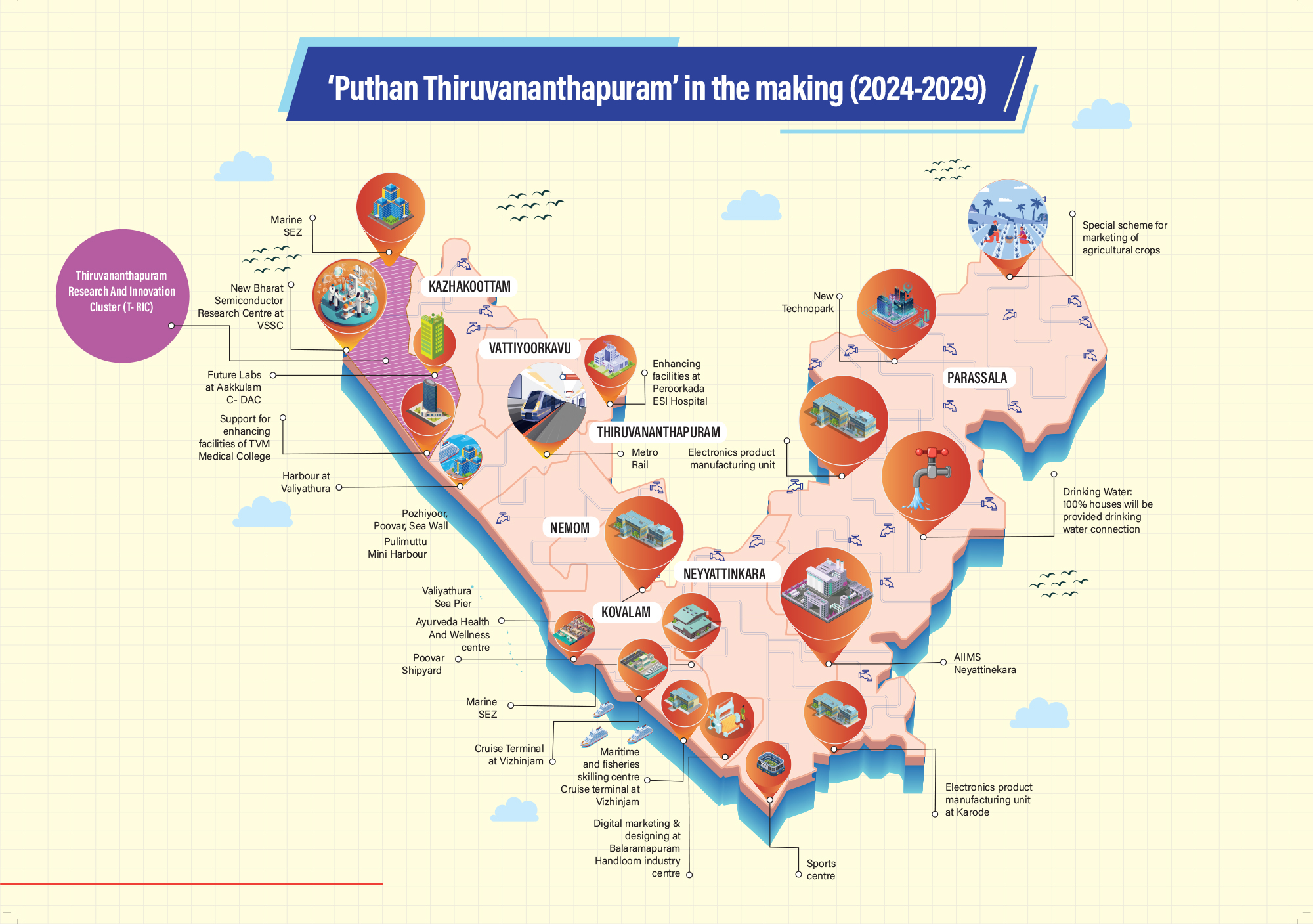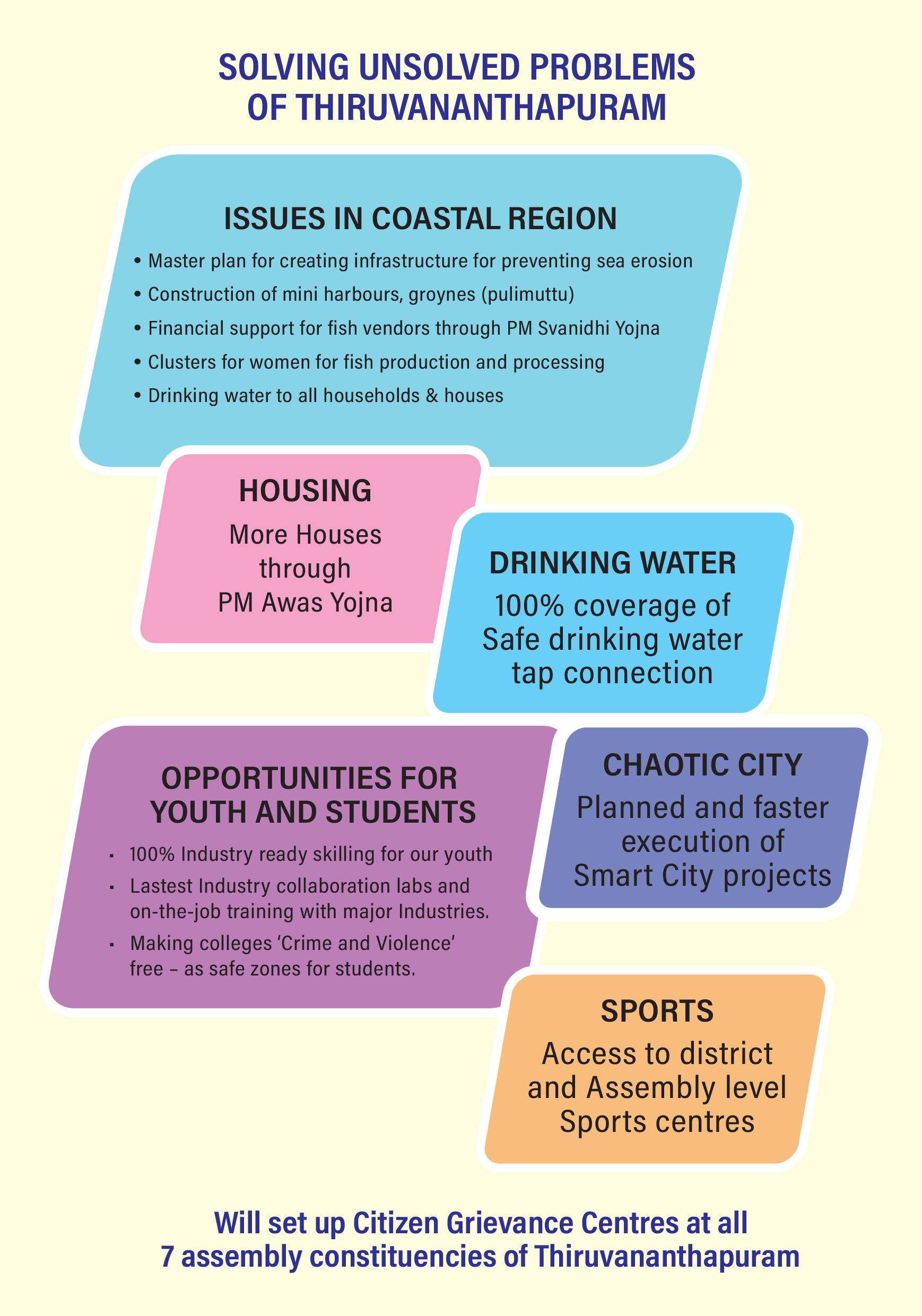 Thiruvananthapuram has many geographical, historical, cultural and artistic advantages, which have to be taken into account to formulate a vision. Quite naturally, maritime development in all its aspects, electronics and IT, including semiconductors, the latest technological innovations, education, health, tourism, textiles, mobility infrastructure including air, road, metro etc should receive special attention. Decades old problems have to be addressed with long term solutions. The lives of common people has to be improved by fulfilling needs of drinking water, houses, health etc.
